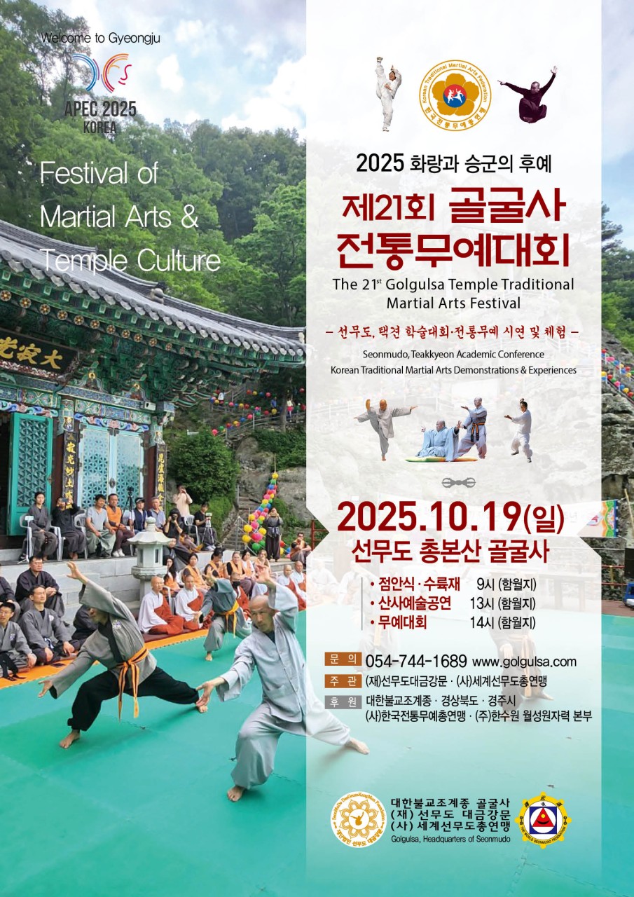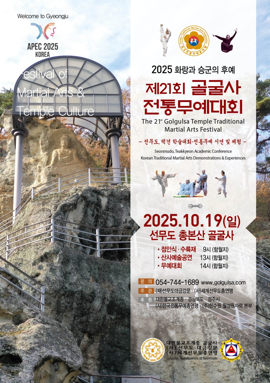 <![CDATA[2025.10.18(토)~19(일) 경주 골굴사 전통무예대회 및 68회 승단심사]]> 1760610879486 Welcome to Gyeongju APEC2025KOREA 2025 화랑과 승군의 후예 제21회 골굴사 전통무예대회 The 21st Golgulsa Temple Traditional Martial Arts Festival 2025.10.19(일) 오후1시 산사예술공연 오후2시 전통무예대회 선무도 총본산 골굴사 - 선무도, 택견 학술대회•전통무예 시연 및 체험 - Seonmudo, Teakkyeon Academic Conference Korean Traditional Martial Arts Demonstrations & Experiences BandPhoto_2025_10_16_19_31_52 BandPhoto_2025_10_16_19_32_38